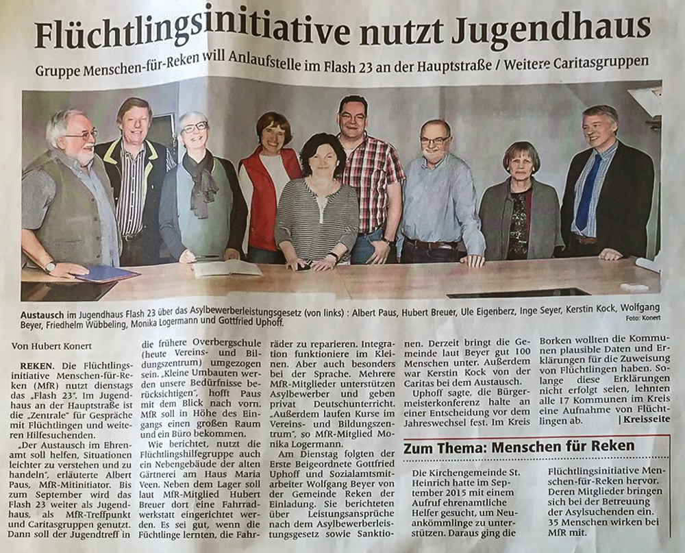 Ausführliche Gespräche führten „Menschen für Reken“ mit Herrn Kohnert von der Borkener Zeitung, der auch den folgenden Bericht verfasste, und Vertretern der Gemeinde Reken über neue Entwicklungen in Reken, die die Arbeit von MfR betreffen.