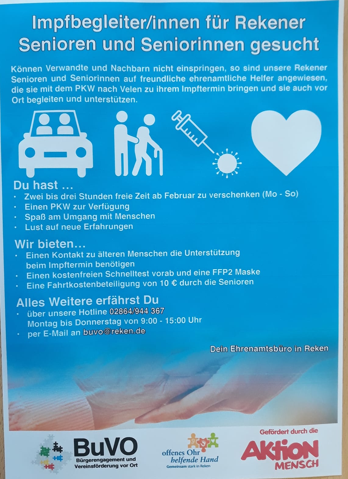 Ich möchte mich beim Ehrenamtsbüro Reken herzlich dafür bedanken, dass meine Mutter (88 jährig) zweimal zu Ihrem Impftermin gefahren wurde. Ein Dankeschön an alle ehrenamtlichen Helfer vom Fahrdienst.